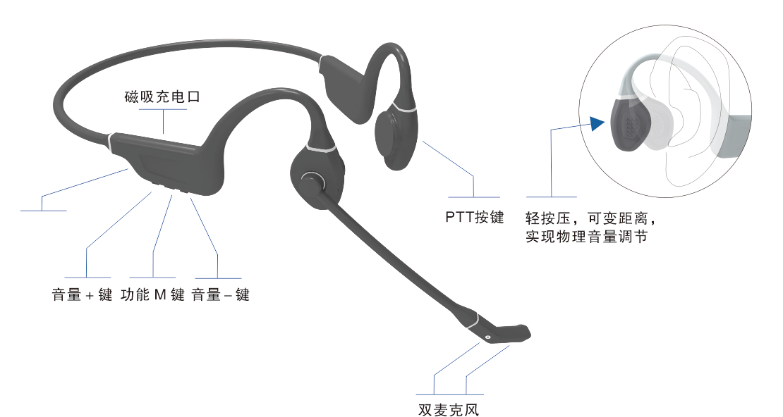 這是一種不放在外耳道內的骨傳耳機。骨傳導是利用骨頭震動傳音原理,不入耳,不需要直接通過耳膜傳輸,骨感傳導新概念直接通過頭骨把聲音傳導到耳朵內部神經(jīng)。