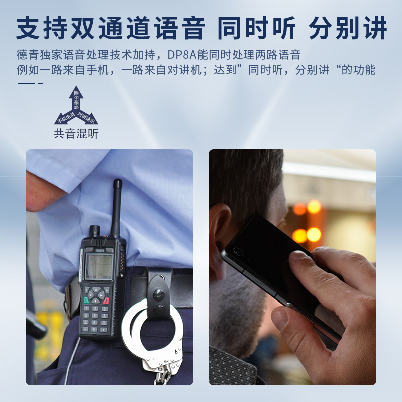 共音混聽:支持同時連接兩路語音,同時聽、分別講、相互保密,滿足了警務(wù)人員在不同場景下的通訊需求。
