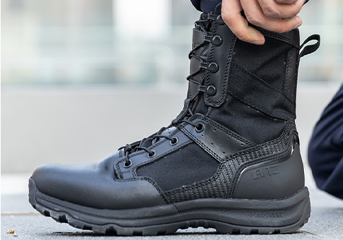頭層防水粒面牛皮、復(fù)合防刺中底、快拉鞋帶扣、鞋底纖維負(fù)載支撐系統(tǒng)、高強(qiáng)度尼龍牛津布、歐索萊鞋墊