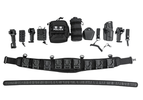 由塑料扣外腰帶、戰(zhàn)術手電套、對講機套、工作包、軟質(zhì)水壺套、手銬套、戰(zhàn)術棍套、戰(zhàn)術掛鉤、戰(zhàn)術噴霧套、通用塑鋼槍套組成